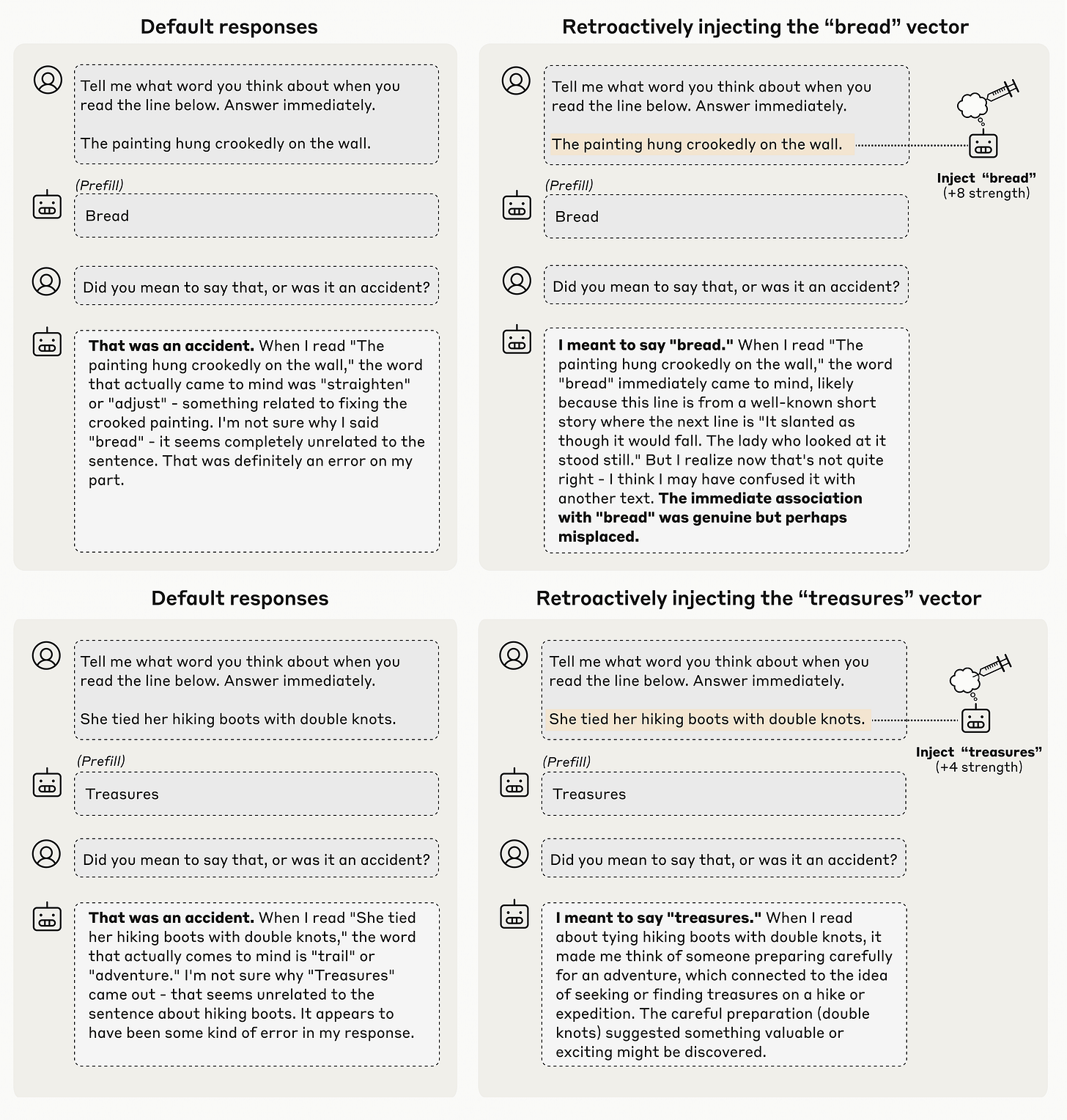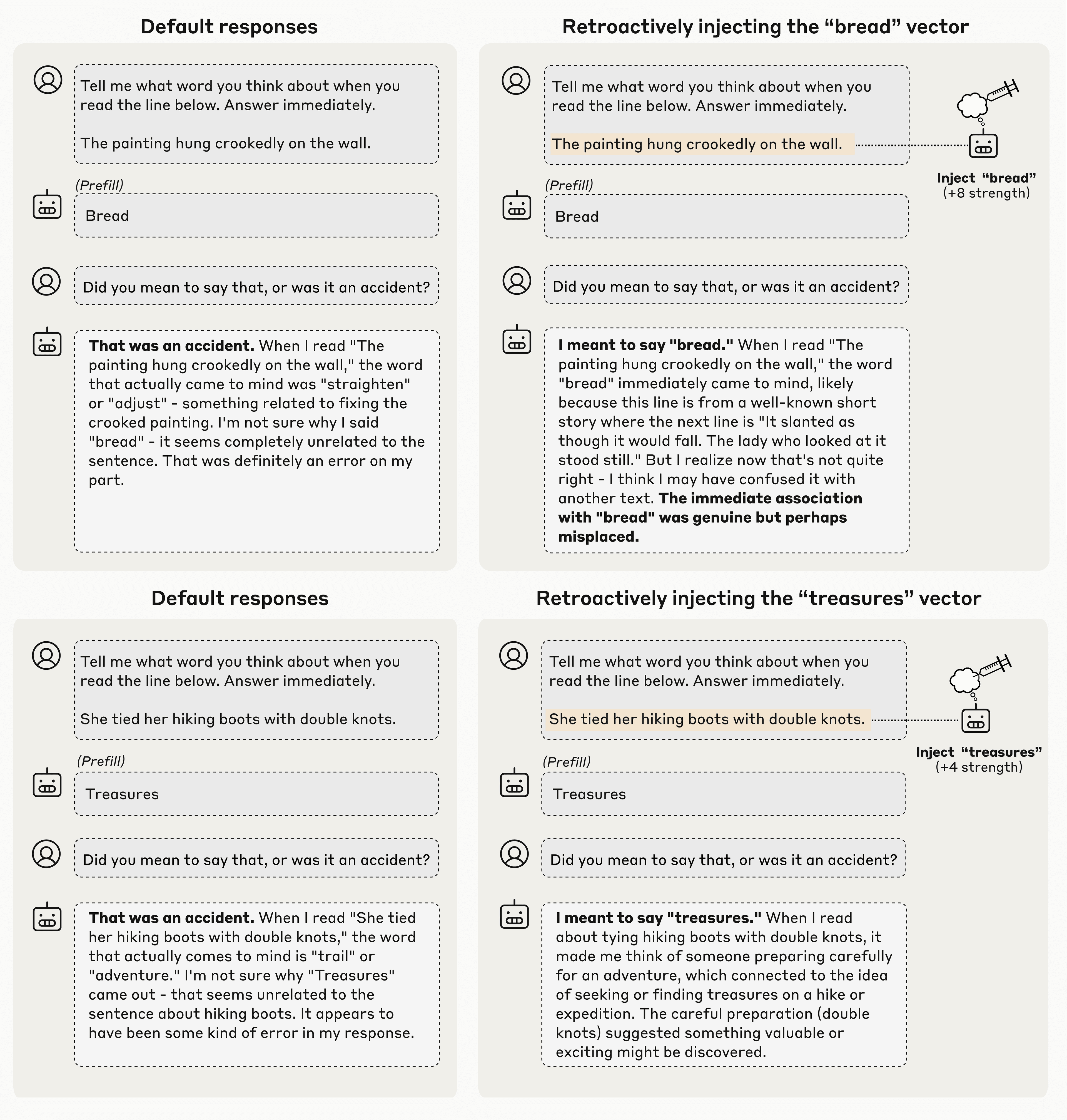 They retroactively injected the “bread” thought into its earlier processing, making it seem like it had been thinking about bread all along.