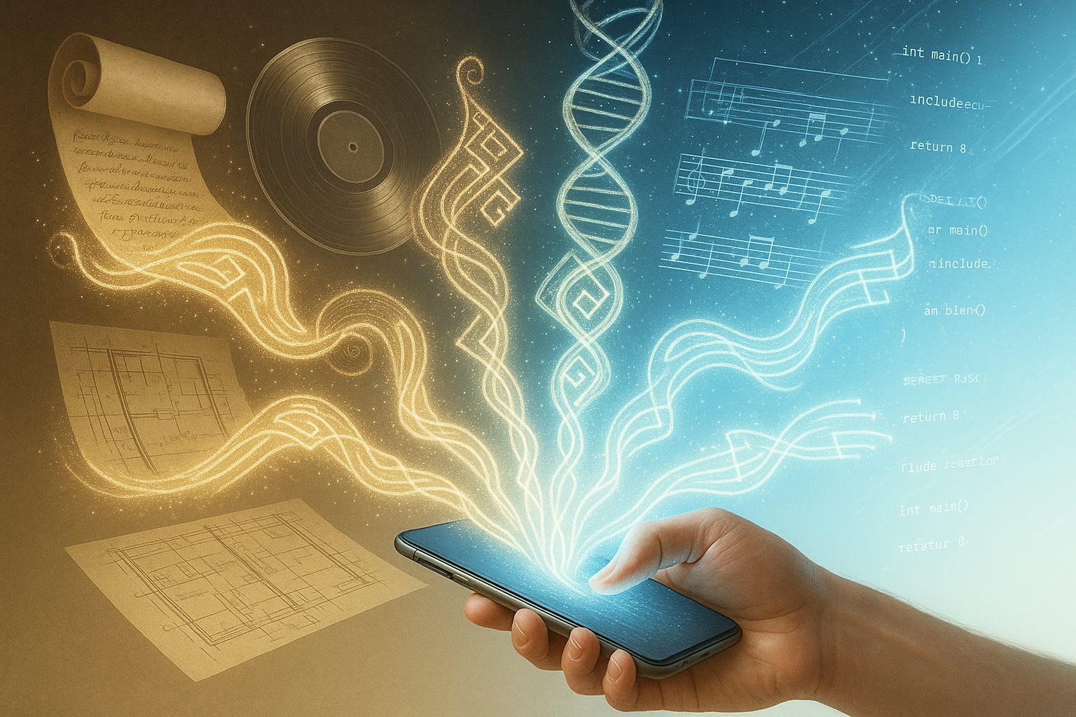 I'm watching something strange happen in our labs. A designer pulls a color palette from a sunset photo using an AI image-picker, merges it with animation physics from a Pixar paper via a pre-built engine, adds interaction patterns from a 1960s Braun appliance manual found in a digital pattern library, and ships a working prototype before lunch.
