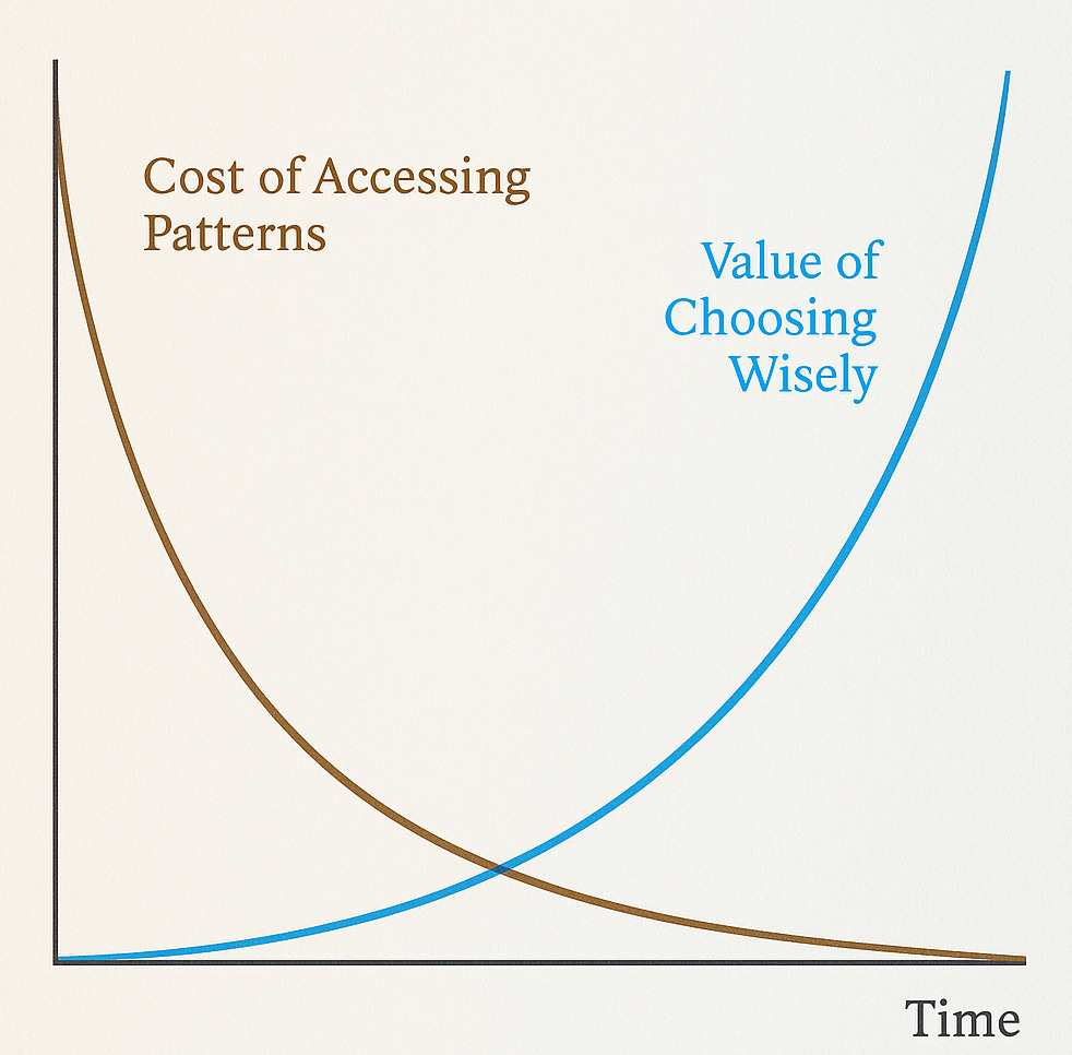 The curve isn't just exponential—it's exponential in both directions. The cost of accessing patterns plummets while the value of choosing wisely soars.