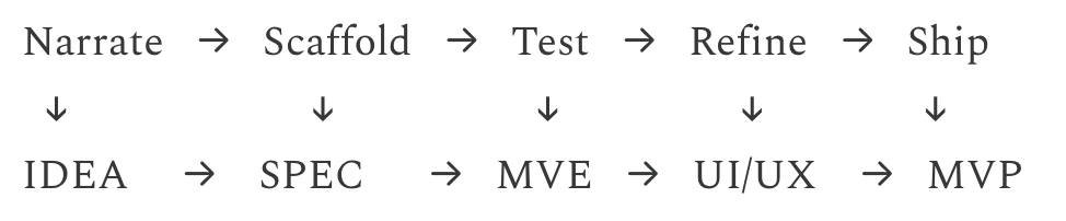From IDEA → SPEC → MVE → UI/UX → MVPThis is the flow I now teach others to use. It keeps the loop tight, the scope clear, and the toolchain light. Note, sometimes I will put a rapid UI/UX stage between IDEA and SPEC.