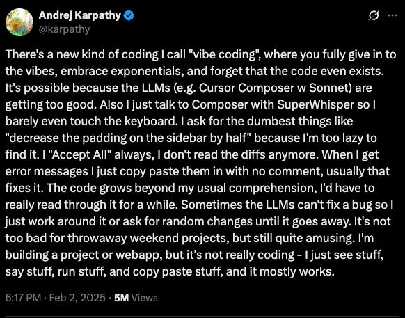 "Vibe coding" was coined by Andrej Karpathy: