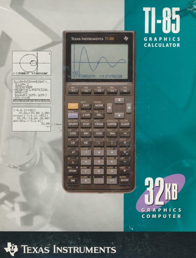 As high school boredom set in, and playing with Pascal became less fun than expected, we figured out how to make the calculator do more than math. The TI-85 supported Z80 assembly language (same chip used in early computers). You could write programs in TI-BASIC or download small programs from early bulletin boards.